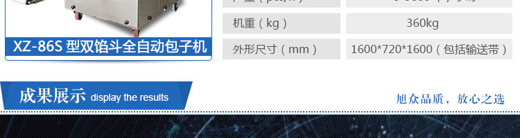 名称XZ-86S型双馅斗全自动好色先生污污 电源220/380V(见机器名牌) 功率2.4kw 产量0-3600个/小时 尺寸1600*720*1600mm(包括输送带) 重量360kg 规格20-150克/个 其他