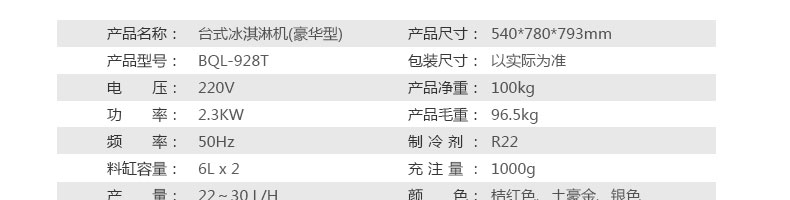 名称BQL-928T台式冰淇淋机 电源220V 功率2.3kw 产量22-30L/H 尺寸540*780*793mm 重量96.5kg 规格 其他