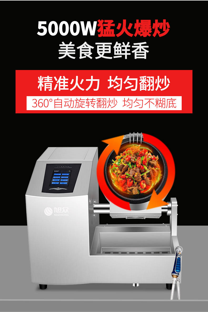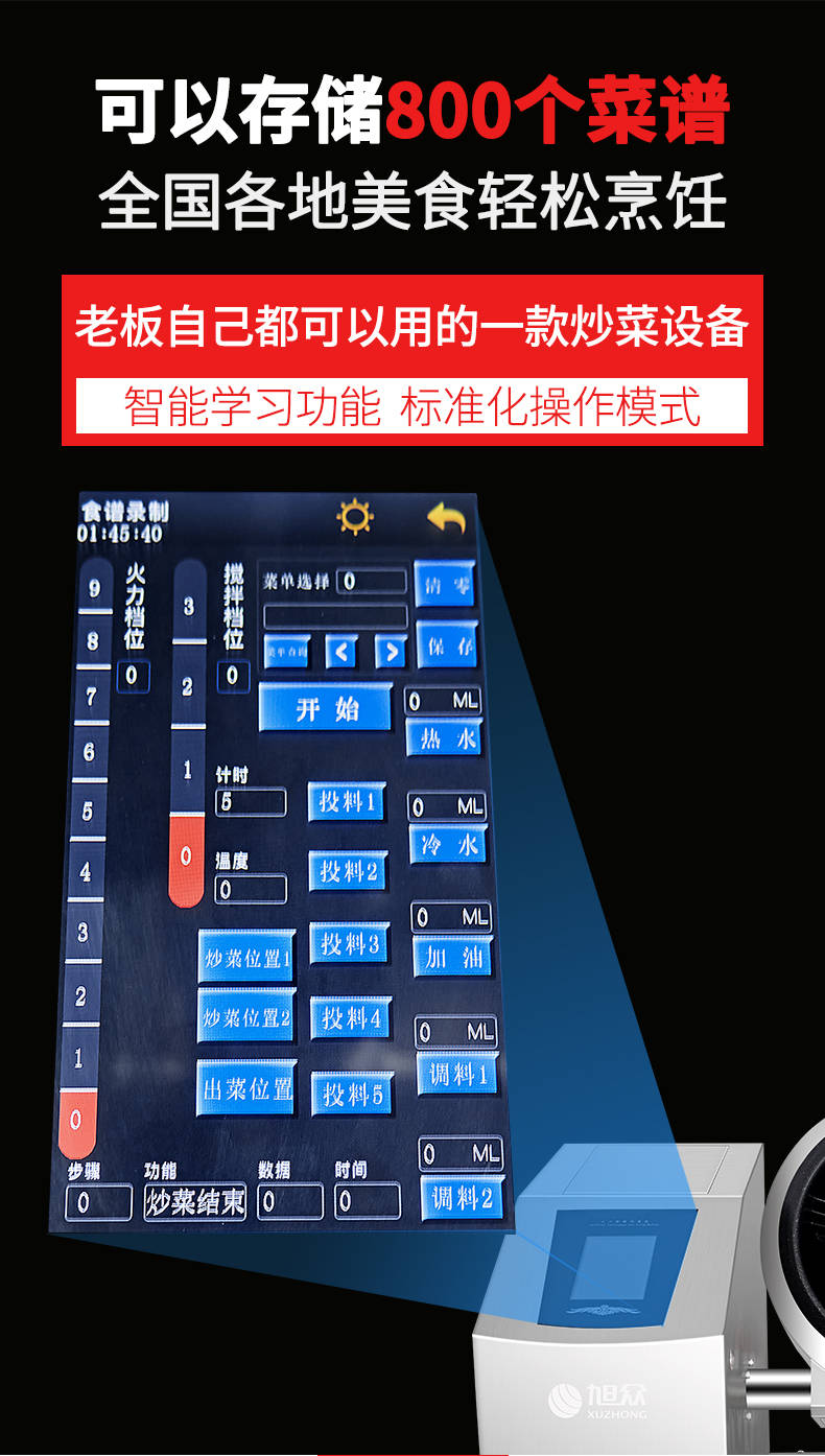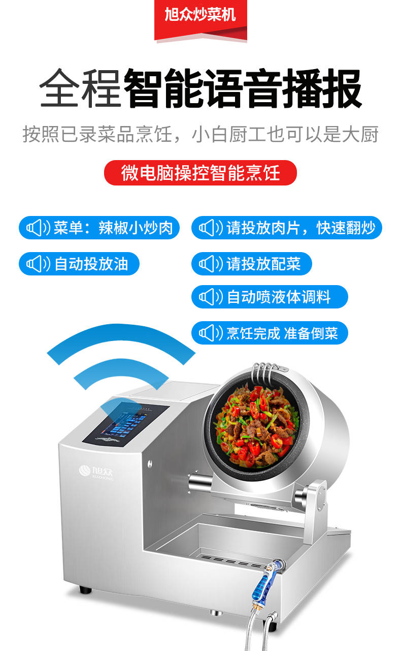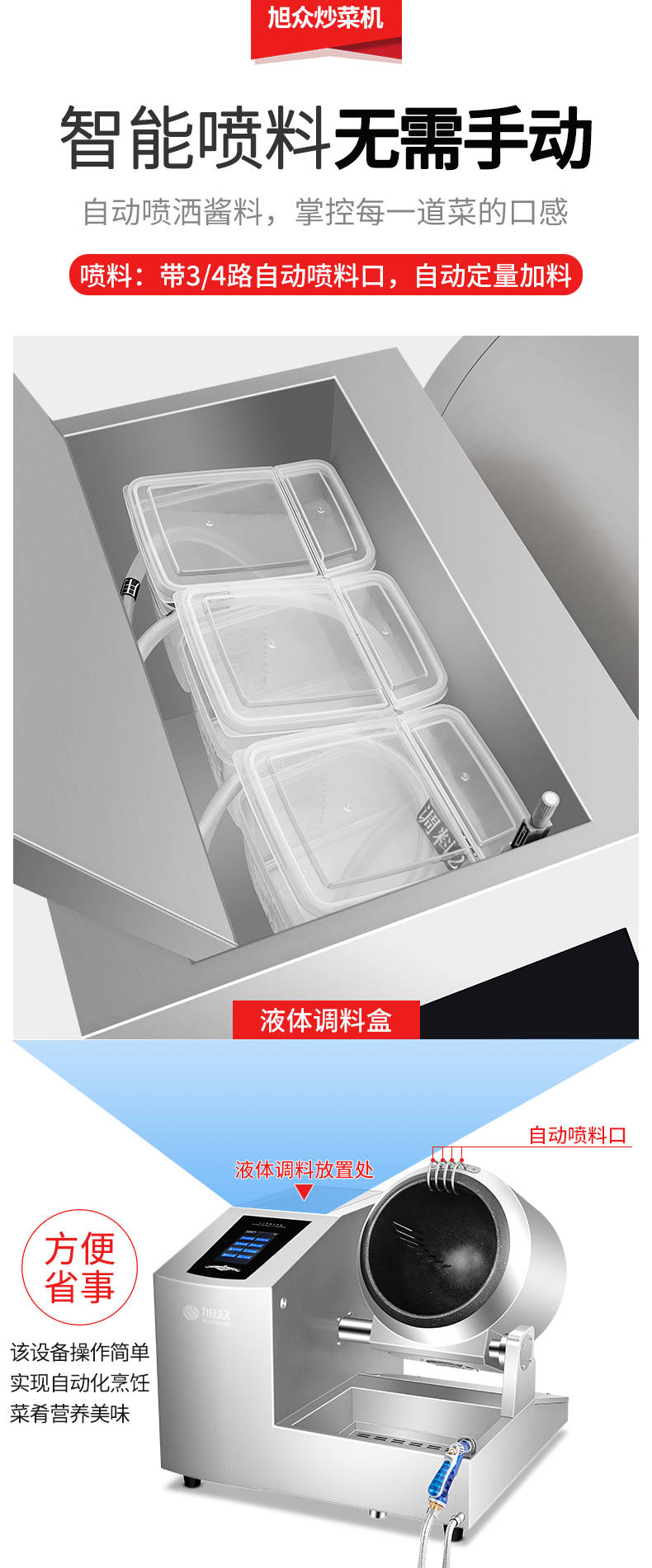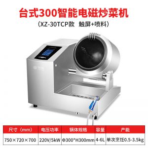 XZ-30TCP台式300智能电磁炒菜机(触屏+喷料),可以实现自动化烹饪过程的智能化设备,语音播报、自动喷料、旋转翻炒、快速出菜。实现自动化烹饪,新一代微电脑操控智能烹饪设备、颠覆传统炒菜模式。5000W猛火爆炒美食更鲜香