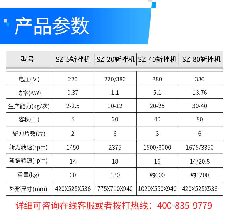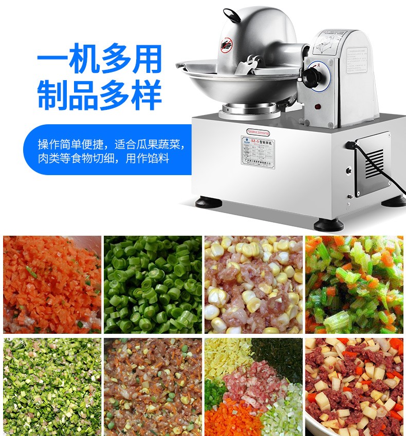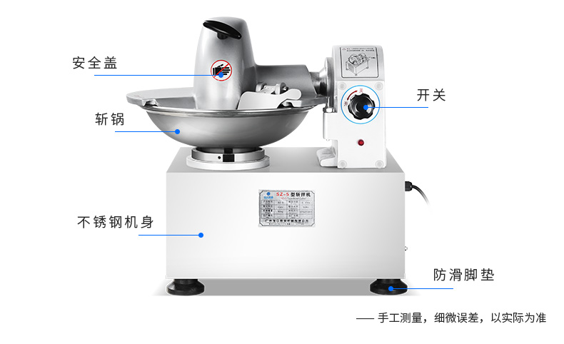 SZ-5型斩拌机,全自动斩拌机,高效安全、节能便捷、适用于制作各种馅料。可斩拌多种制品,可制作瓜果,蔬菜,肉类切细用作馅料。优质选材打造不锈钢机身,机身稳定,经久耐用,易于清洗。