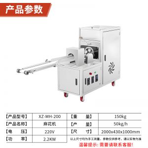 名称XZ-MH-200麻花机 电源220/380V 功率2.2KW 产量40-60斤/小时 尺寸1970X500X1000mm 重量90KG 规格可调 其他