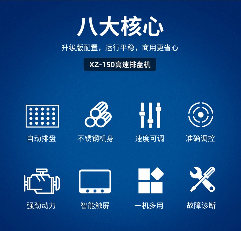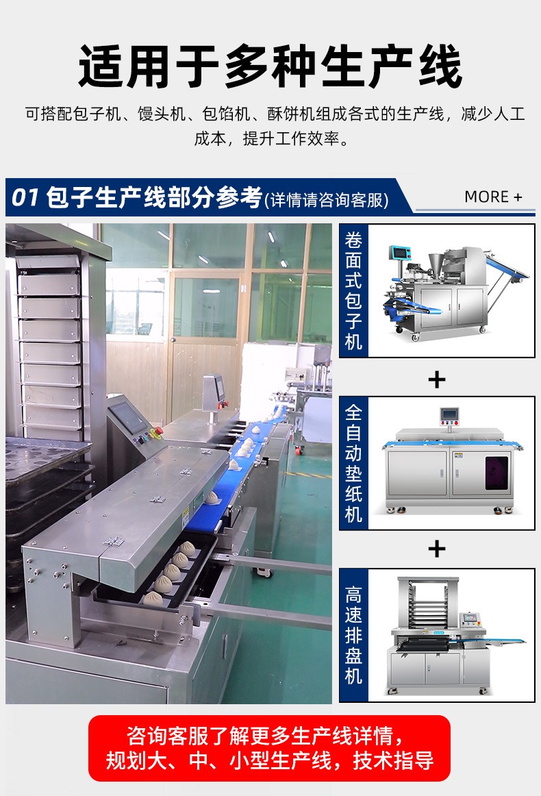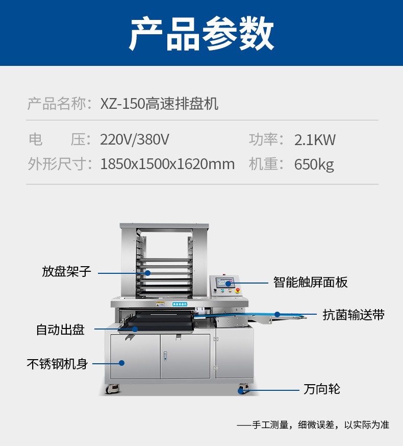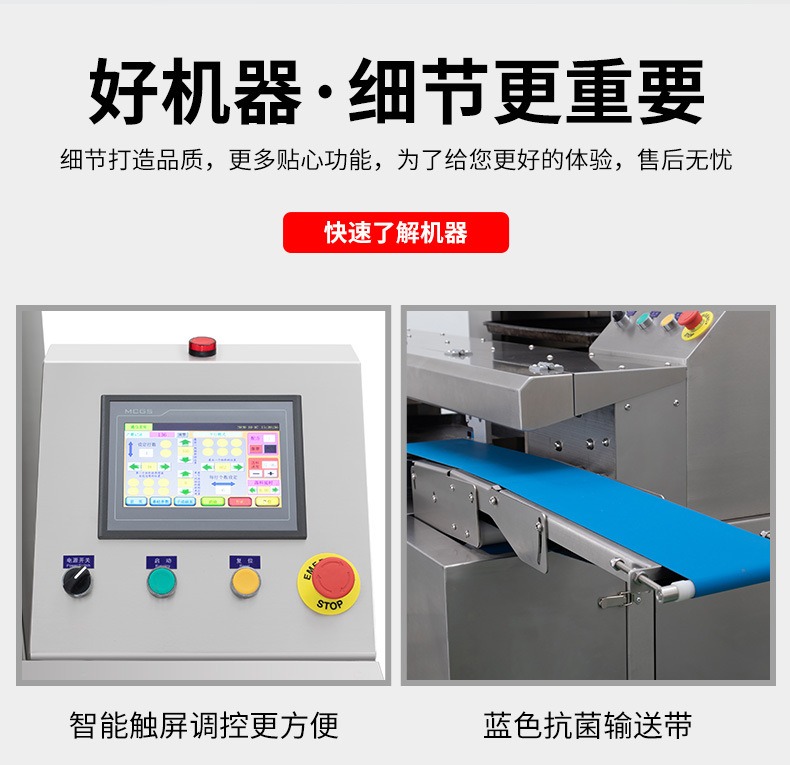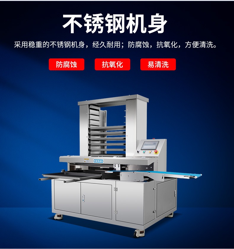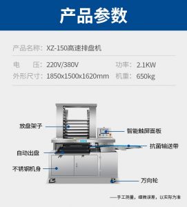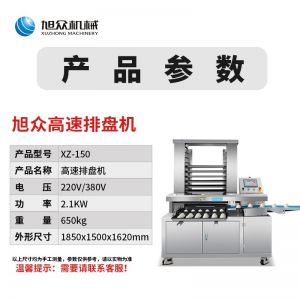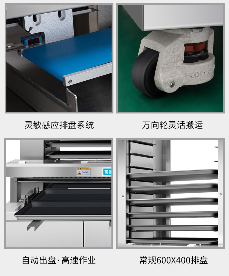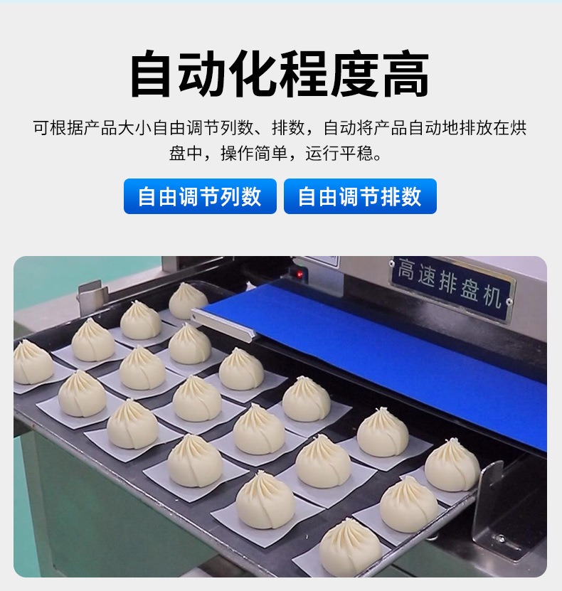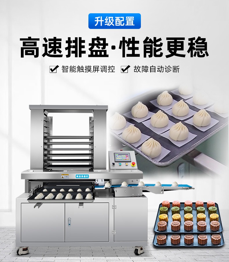 多功能商用高速排盘机,自动化程度高,可根据产品大小自由调节列数、排数,自动将产品自动地排放在烘盘中,操作简单,运行平稳。智能触屏面板。控制系统由三菱PLC和进口触摸屏组成,操作简单方便。具有故障自动诊断,一目了然。