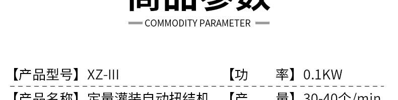 名称XZ-III定量灌装自动扭结机 电源220V 功率0.1KW 产量30-40个/min 尺寸700×800×1600mm 重量165kg 规格50g-1000g 其他【料斗容量】23/63升(标配23L)