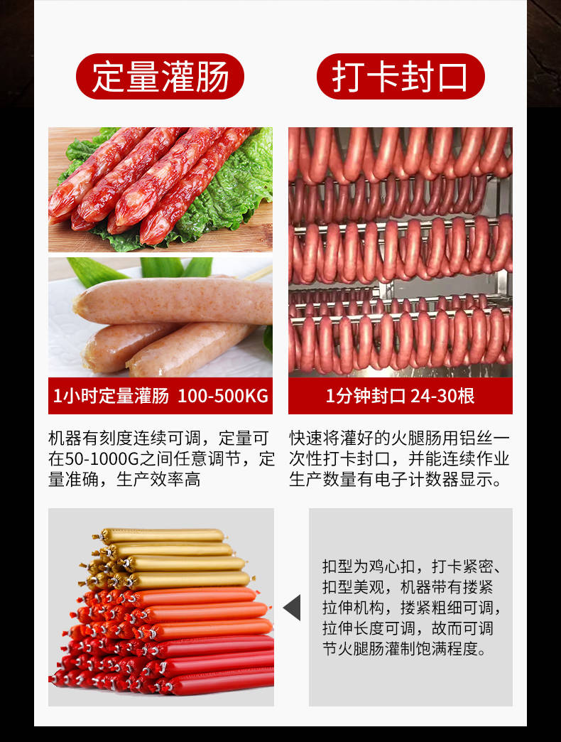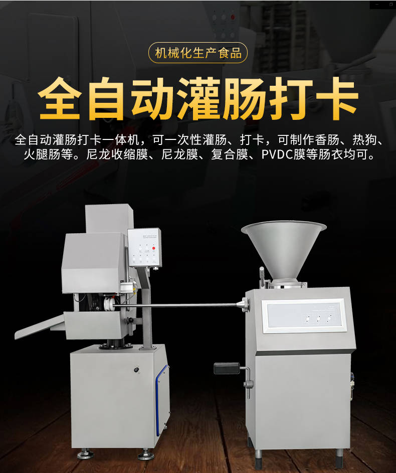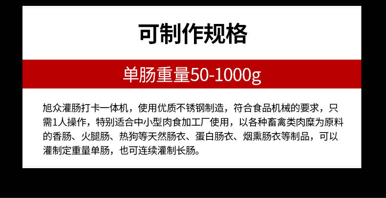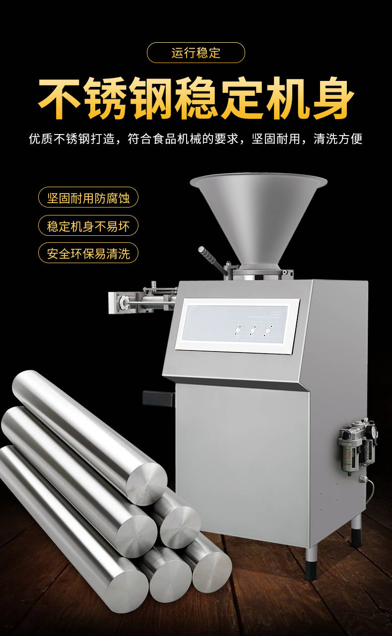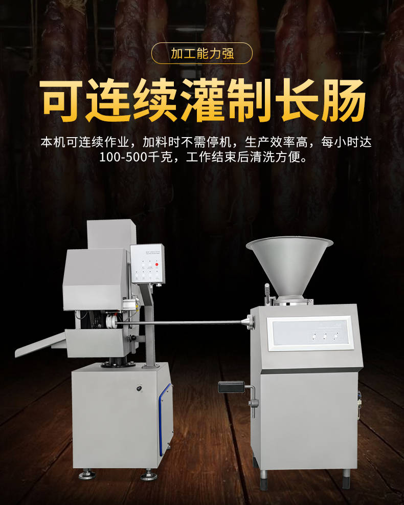 XZ-I型自动定量灌肠机,使用优质不锈钢制造,符合食品机械的要求,只需1人操作,特别适合中小型肉食加工厂使用,以各种畜禽类肉糜为原料的香肠、火腿肠、热狗等天然肠衣、蛋白肠衣、烟熏肠衣等制品,可以灌制定重量单肠,也可连续灌制长肠。