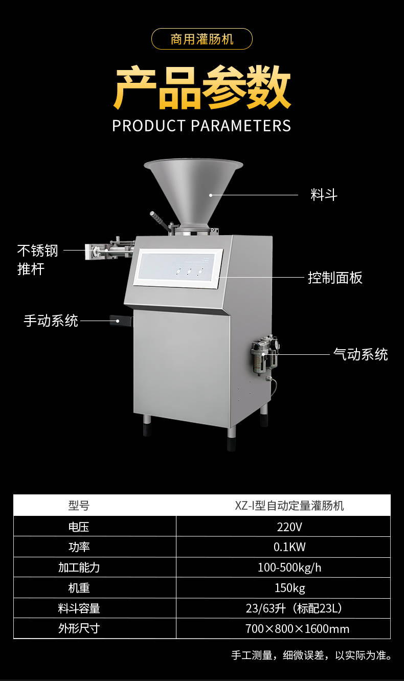 名称XZ-I型自动定量灌肠机 电源220V 功率0.1KW 产量100-500kg/h 尺寸700×800×1600mm 重量150KG 规格 其他料斗容量23/63升(标配23L)