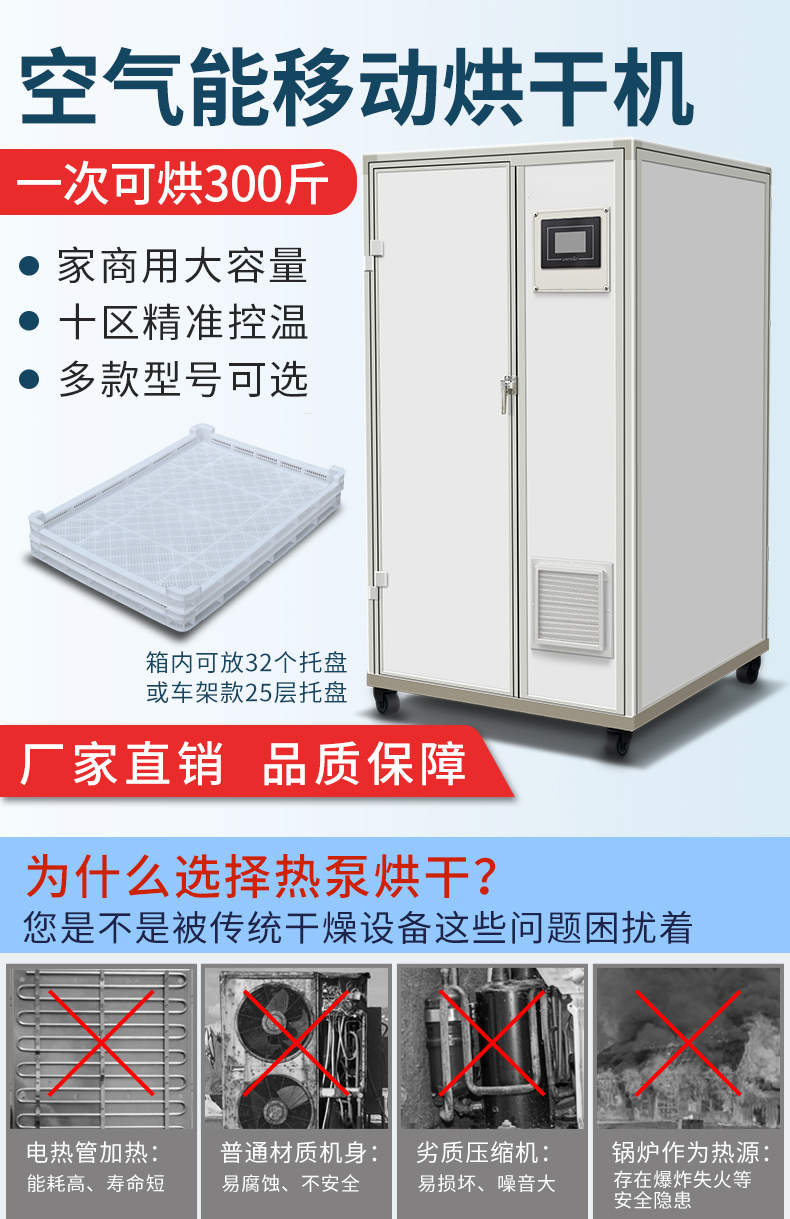 烘干抽湿一体机(带烘房),空气能移动烘干机,一次可烘300斤、家商用大容量、十区精准控温、多款型号可选。智能烘干时代出类拔萃的新体验