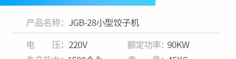 名称28小型饺子机 电源220V 功率90KW 产量1500个/h 尺寸350*370*480mm 重量45KG 规格 其他