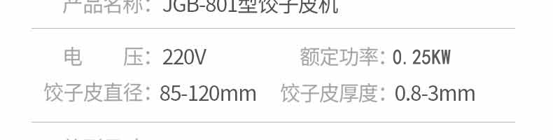名称801饺子皮机 电源220V 功率0.25KW 产量 尺寸650*380*750MM 重量 规格 其他