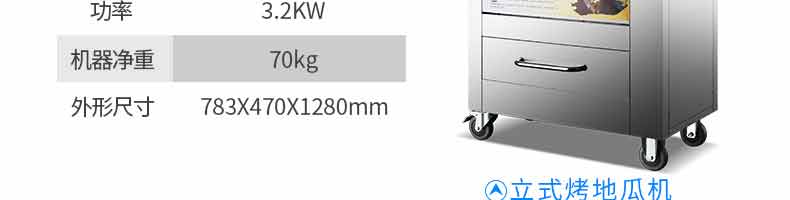 名称台式地瓜机 电源220V 功率2.0KW,3.2KW 产量 尺寸620*500*680mm,783*470*1280mm 重量41KG,70KG 规格 其他