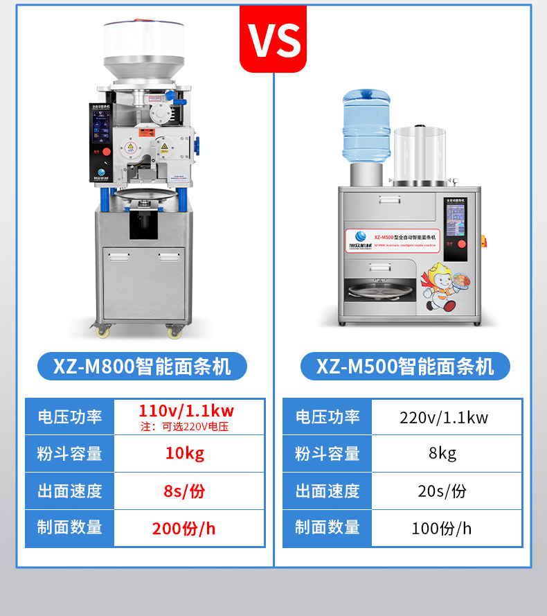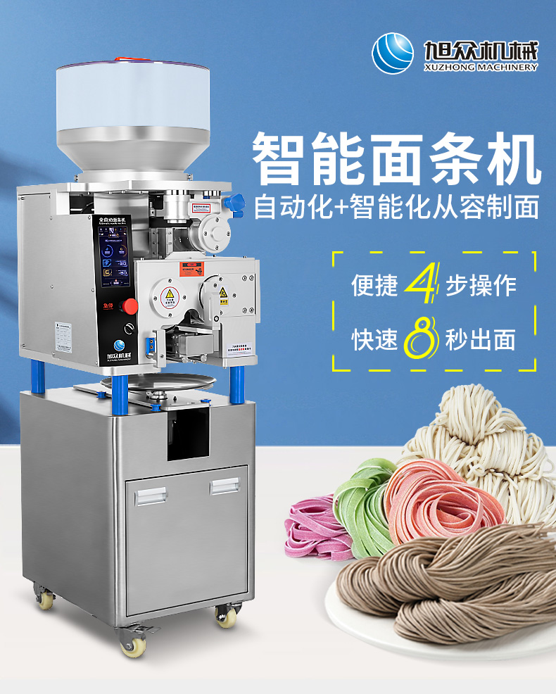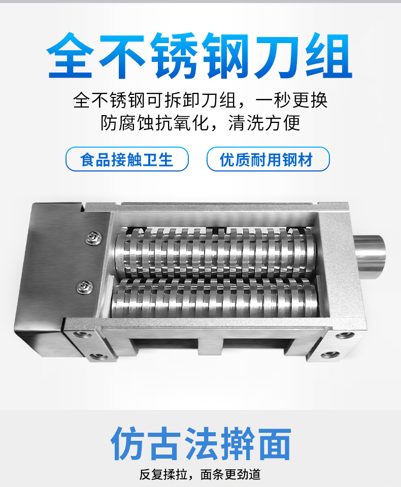 XZ-M800面条机,制作多种面条:拉面、小面、牛肉面、韭叶面板面、裤帯面、蔬菜面、水果面、杂粮面8秒快速出面人性化设计,更便捷更高效与同类型机器相比,出面更快、秒换刀具。全不锈钢刀组全不锈钢可拆卸刀组,一秒更换防腐蚀抗氧化,清洗方便。