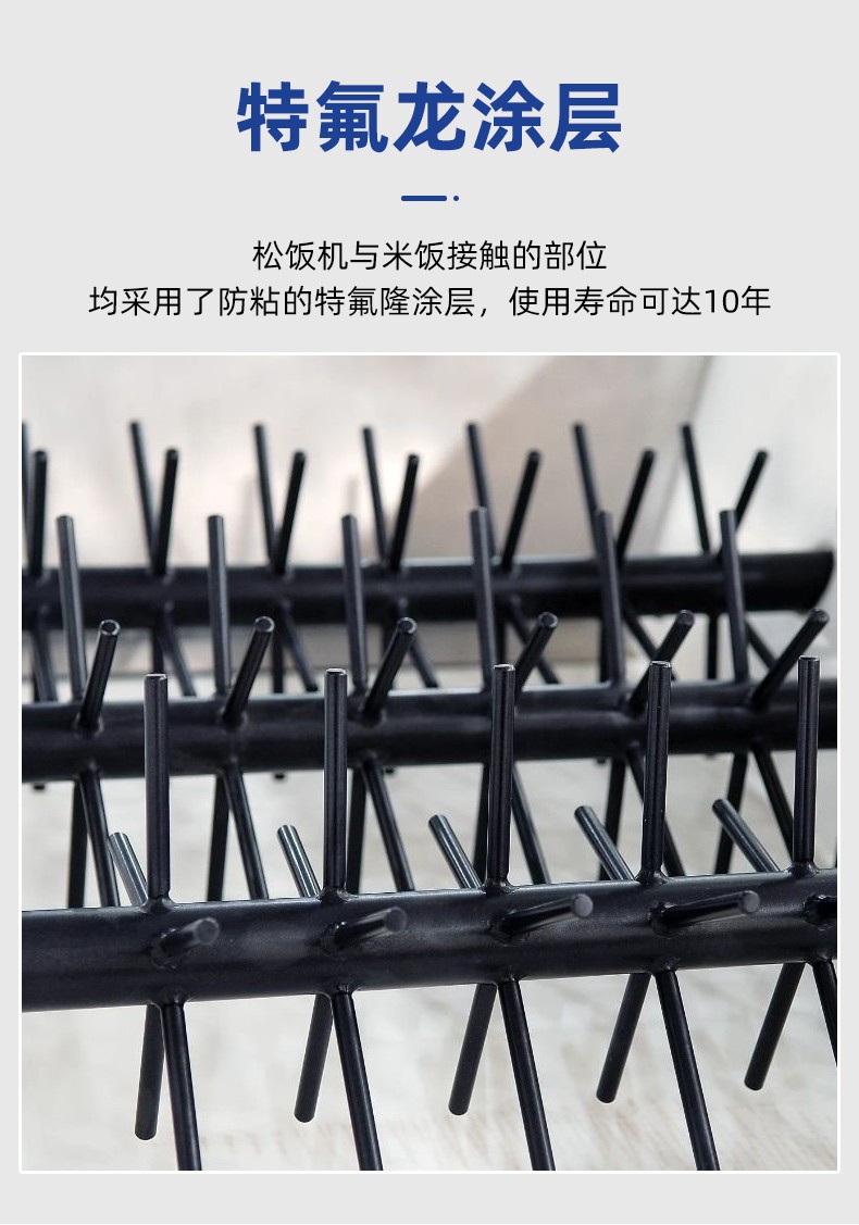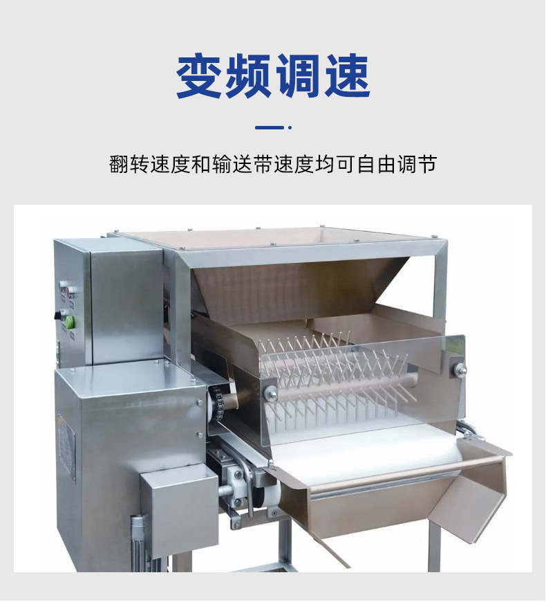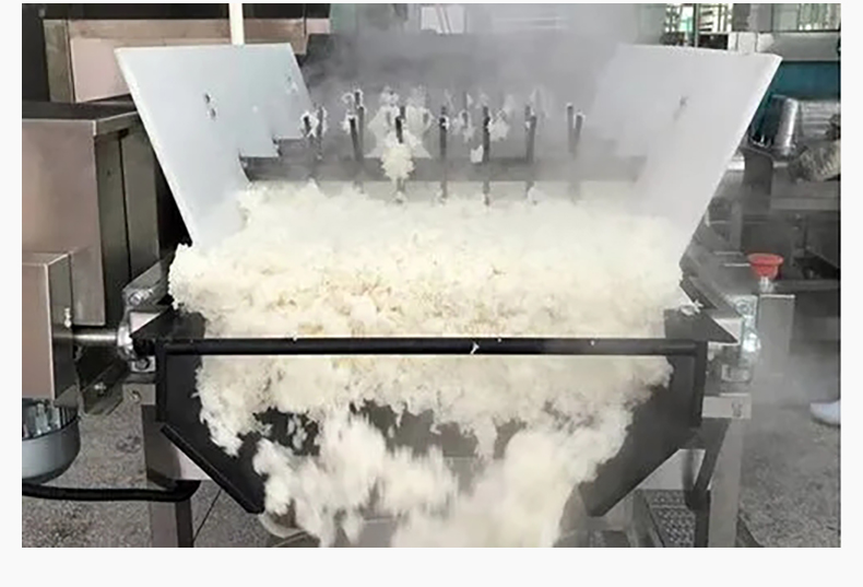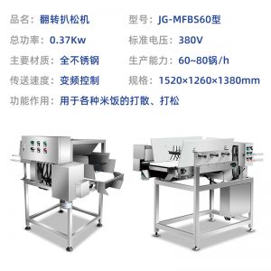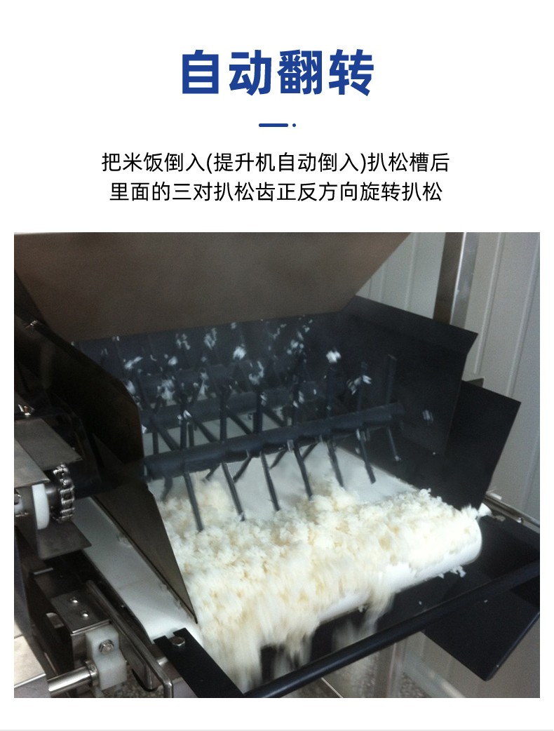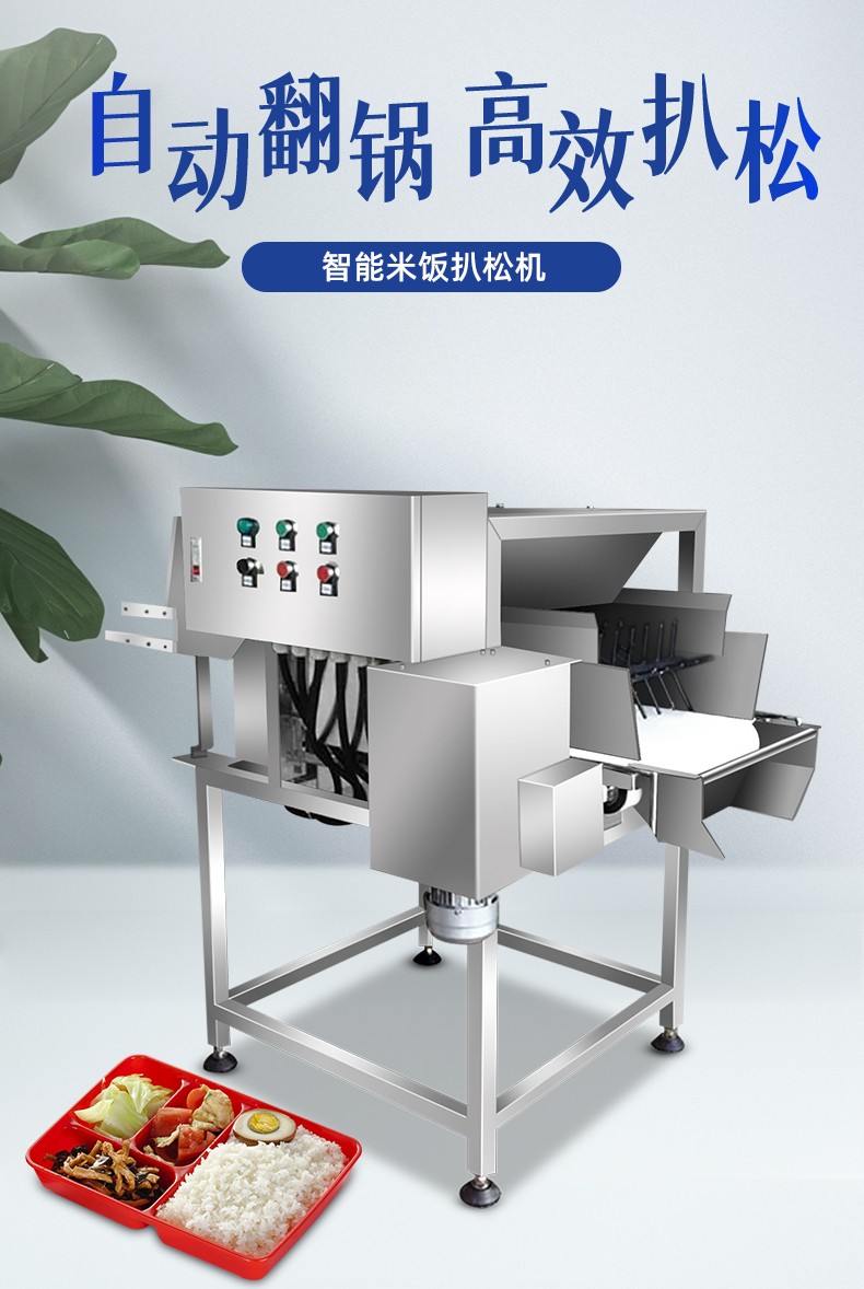智能米饭扒松机-翻转扒松机,主要结构:由不锈钢机架、翻锅机构、扒松机构输送机构和电气自动系统等组成。适用对象:主要用于中央厨房、团膳、企事业单位食堂等