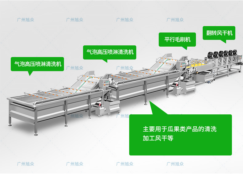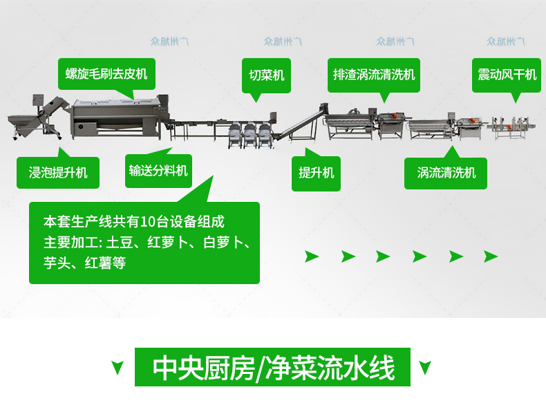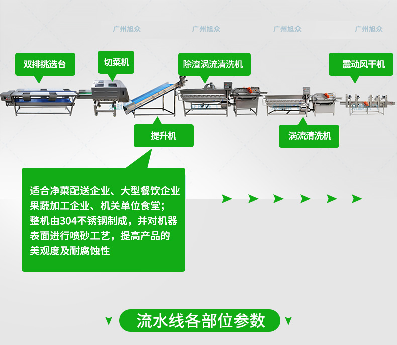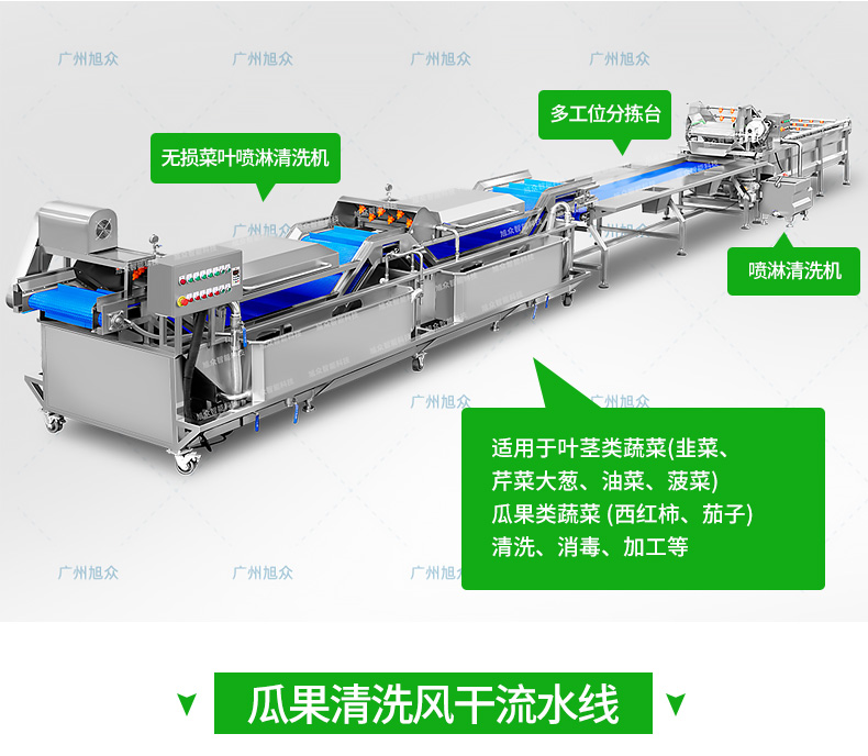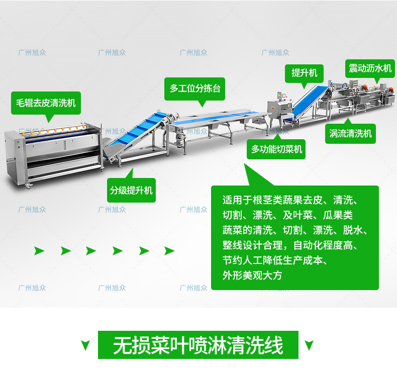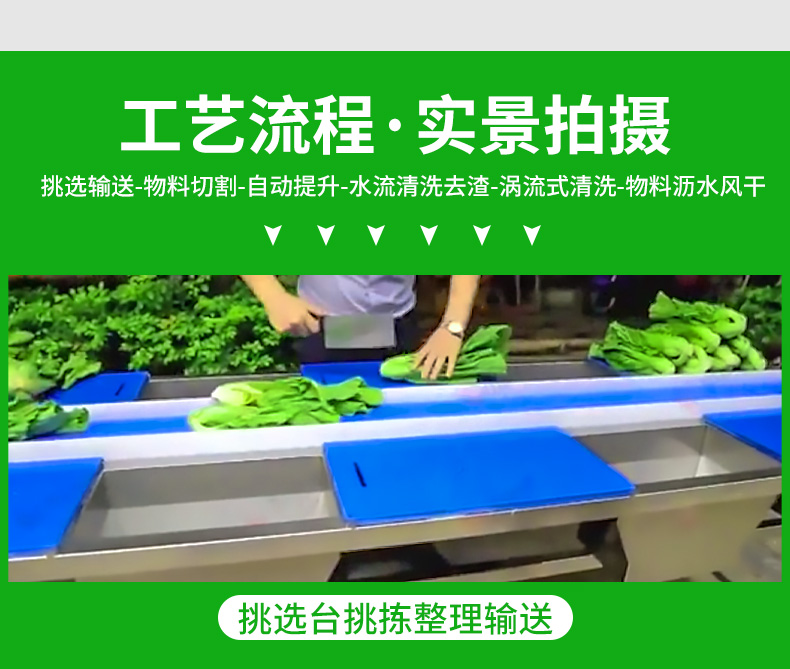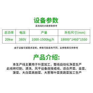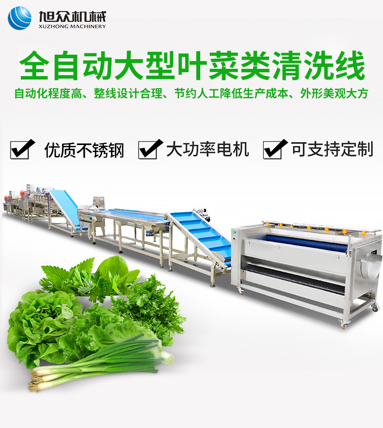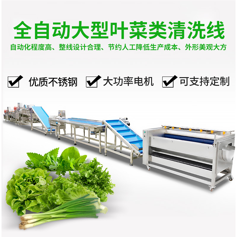 全自动大型叶菜清洗线,自动化程度高、整线设计合理、节约人工降低生产成本、外形美观大方。主要用于叶菜加工,整线自动化净菜生产此线将切割、清洗、风干设备连接成线,适合芹菜、韭菜菠菜、大白菜高丽菜、大葱等叶菜类蔬菜加工生产