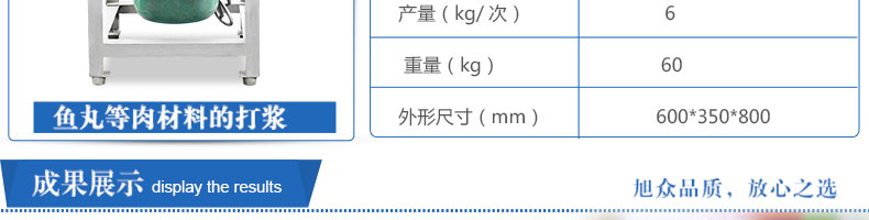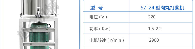 名称SZ-24型高速肉丸打浆机 电源220/380V(见机器铭牌) 功率1.5-2.2kw/3kw 产量6千克/小时 / 10千克/小时 尺寸355*405*950mm / 800*400*950mm 重量55kg/130kg 规格 其他