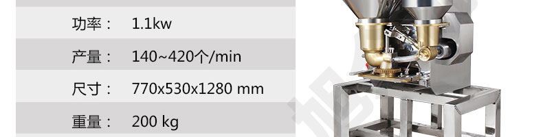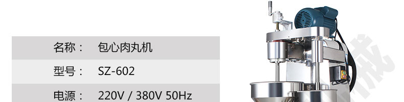 名称SZ-602包心肉丸机 电源220/380V(见机器铭牌) 功率1.1kw 产量140-420个/分钟 尺寸770*530*1280mm 重量200kg 规格 其他