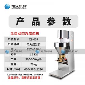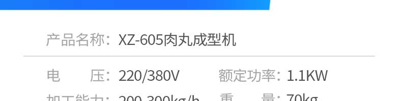 名称605肉丸成型机主图 电源220/380v 功率1.1kw 产量200-300kg/h 尺寸680*380*1220mm 重量70kg 规格 其他
