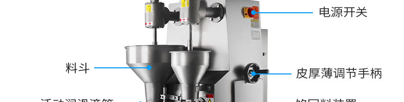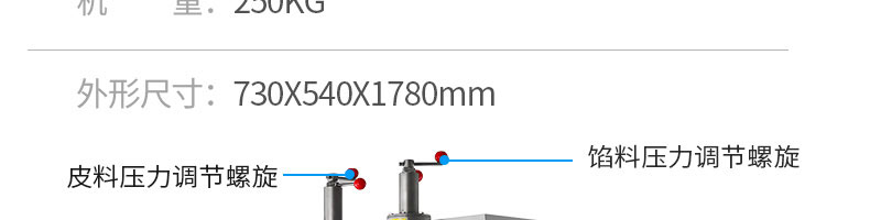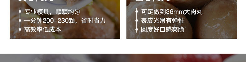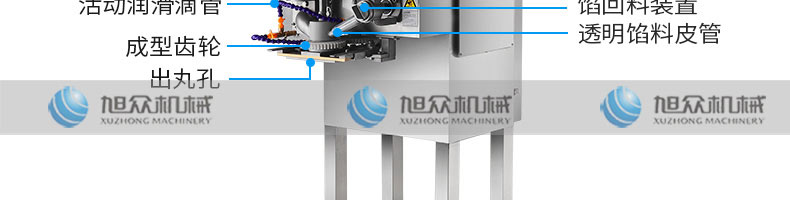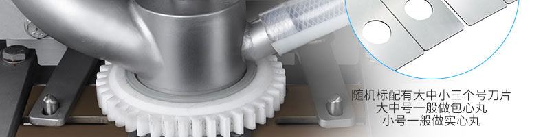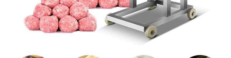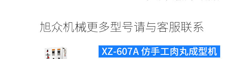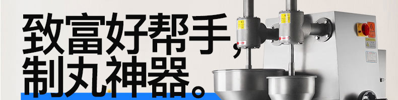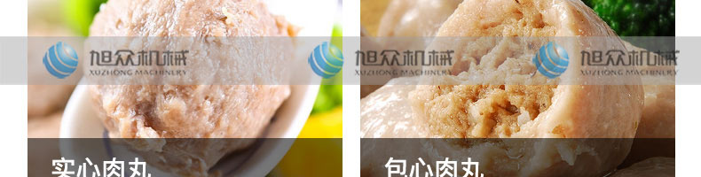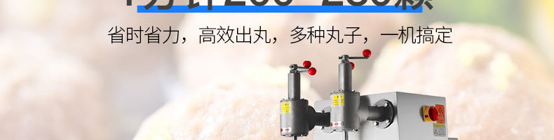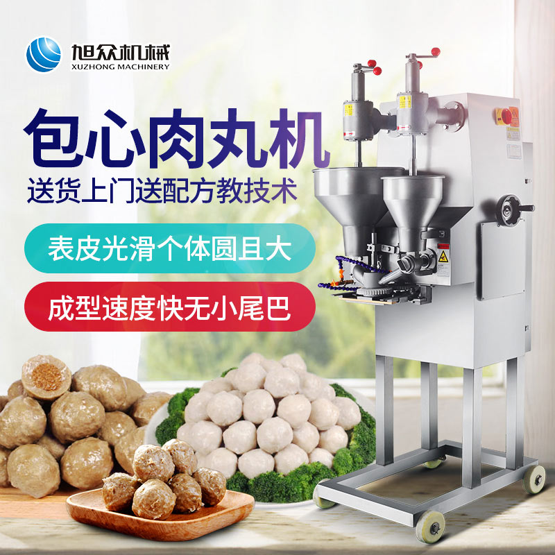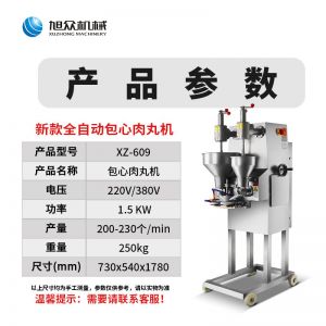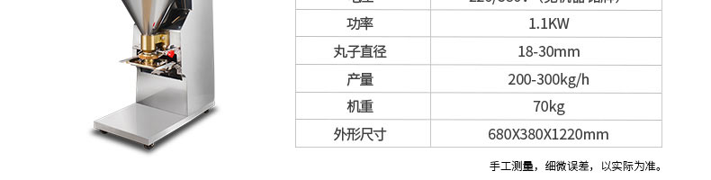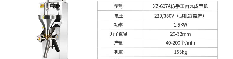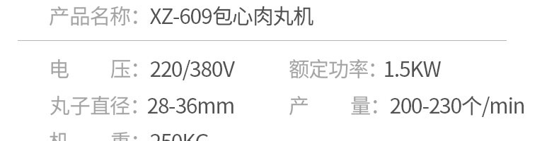 名称XZ-609包馅肉丸机 电源220/380v 功率1.5kw 产量200-300个/min 尺寸730*540*1780mm 重量250kg 规格丸子直径:28-36mm 其他