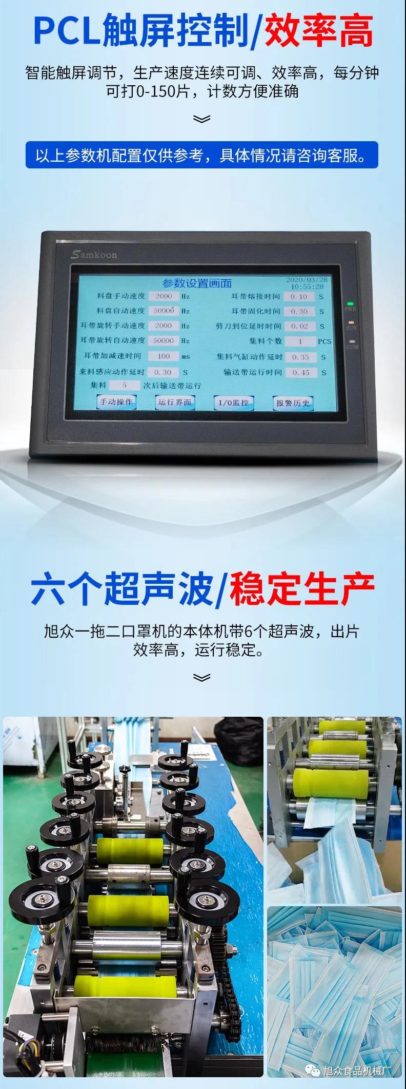 好色先生网站牌一拖二口罩机由一台本体机带动两台耳带机组成。本体机输出ロ罩本体后,由输送带结构将口罩本体片输送到连接耳带机的输送带上,再通过输送带将口罩片输送到耳带机的正面第一个口罩盘上方,最后通过气缸下压把口罩片放置到耳带机的口罩盘内,后续由耳带机完成口罩的耳带熔接,包边等动作,从而完成一个耳带口罩产品的生产。本机采用PLC、触摸屏控制、主传送带采用单相马达输送、步进马达翻转,传动精确,控制稳定,速度可调。